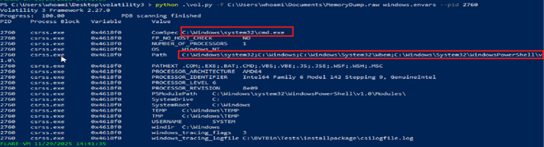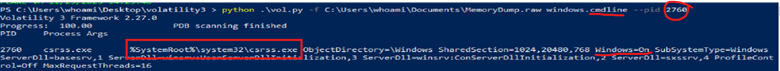 Şimdi burada gördüğümüz gibi cmdline komutu yardımı ile elimizde olan csrss.exe dosyasının hangi komutlarla işlediğini anlamaya çalışıyoruz. Az önce bize şüpheli gelen dosyanın windows.tree komutuyla PID'sini aldım, sonra da hangi komut satırlarını kullandığımızı gördük. SYSTEMROOT işlemi şu an için çok şüpheli olduğunu söylemek isterim, bunu açıklığa getirdiğime inanıyorum.