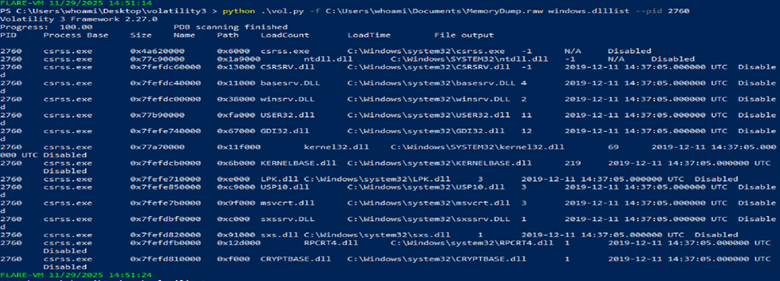 - Hedef İşlem ve Yetenekler: Analizde, sistemin kritik süreçlerinden biri olan csrss.exe'nin (PID 2760) ele geçirildiği tespit edilmiştir. Yüklenen DLL'ler (windows.dlllist çıktısı) incelendiğinde, özellikle USER32.dll ve GDI32.dll gibi kütüphanelerin kullanılması, saldırganın potansiyel olarak tuş vuruşu kaydı (keylogging) ve ekran görüntüsü alma yeteneğine sahip olduğuna işaret etmektedir. CRYPTBASE.dll varlığı ise, şifreleme mekanizmalarının kullanılmış olabileceğini gösterir.