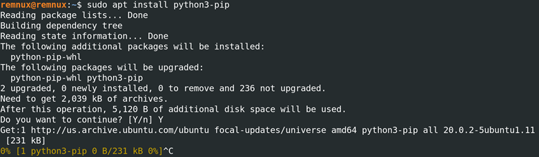 Python3 indirdikten sonra Volatility3 indirebiliriz. Bilgisayarımıza aslında 2 teknik var burada da: İlk olarak terminalden indirebilirsiniz pip3 kullanarak, ikincisi GitHub kullanarak indirme seçeneği var elimizde (https://github.com/volatilityfoundation/volatility3.git). Ben terminali kullanarak indireceğim, bu seçenek benim için daha iyi. sudo apt install python3-pip komutunu kullanarak Remnux sanal makinemize indirebiliriz kolay bir şekilde.