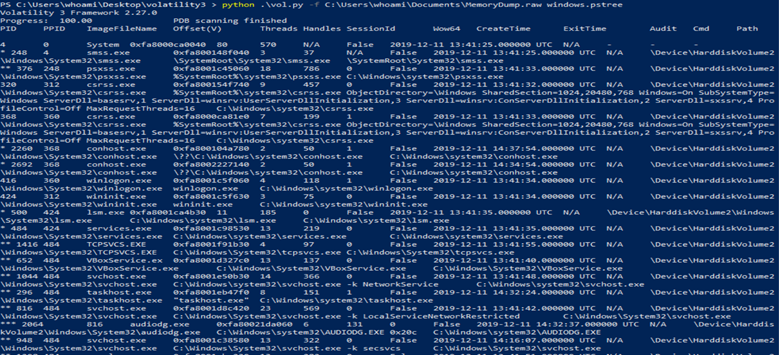 Aslında burada ilk memory forensic öğrendiğiniz zaman ilk olarak windows.pslist bakılıyor. Bu komut aslında belli başlı yerlerde çok iyi. Genel olarak bize derinlemesine bilgiler vermediği için biz de onun yerine windows.pstree komutunu kullanıyoruz. Çünkü bu adımda olabildiğince vol bize geniş bilgileri sunuyor, daha kolay analiz gerçekleştirebiliyoruz böylelikle de.