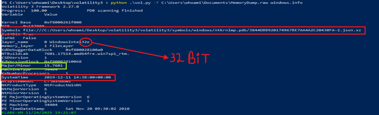 System Time: Arkadaşlar bu, bilgisayarınızda olan .raw dosyanın sistem zamanını gösteren taraftır. Önemli bir işlemdir bu. Tarih eski tarih tabii (2019). Ben mesela gidip bu tarihte olan YARA kurallarına bakabilirim, vendor işlemlerine bakabilirim vs. konular var burada. Aslında kısacası OSINT yaparak sonuçları elde edebilirsiniz. İşletim sisteminin Server bilgilerine bakarak da araştırma yapabilirsiniz. Özellikle de vurguladığım nokta Major ve Minor. Burada verilen 15.7601 ne anlama geldiğini kısacası yazayım: Windows Server 2008 R2 Service Pack 1 işletim sistemine ait olan bir raw dosyası olduğunu bize söylüyor ve burada da güzel bir şekilde OSINT yapmamız kolaylaşıyor.